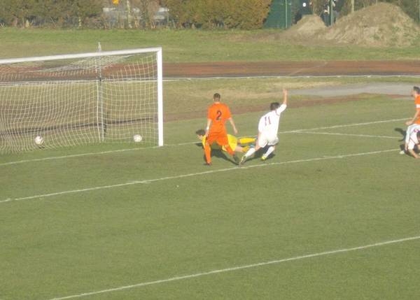Nella foto: la girata-gol di Volpato (a destra in basso) con Isotti che nulla può. E' l'1-0!