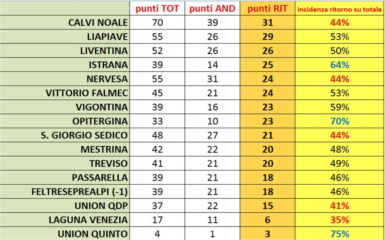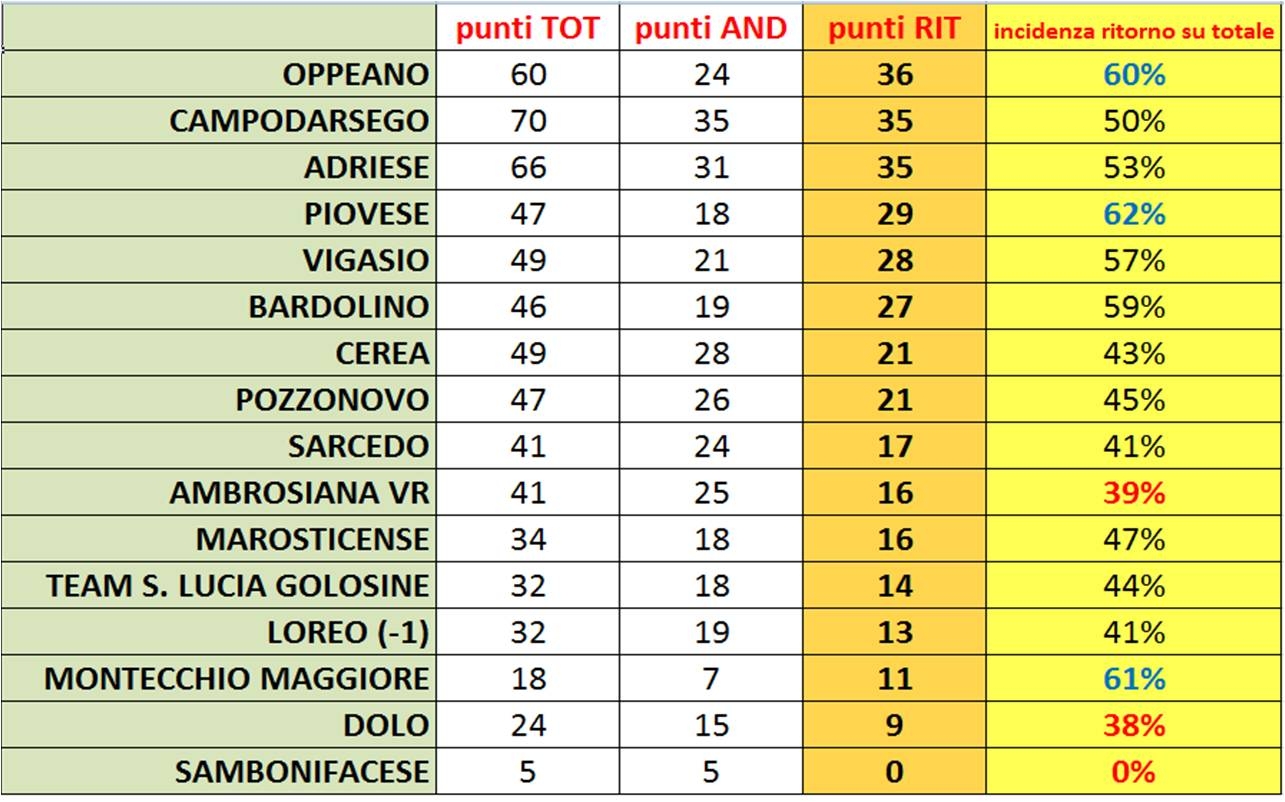 La colonna di destra mostra, in percentuale, chi è migliorato e chi è peggiorato di più rispetto all'andata.