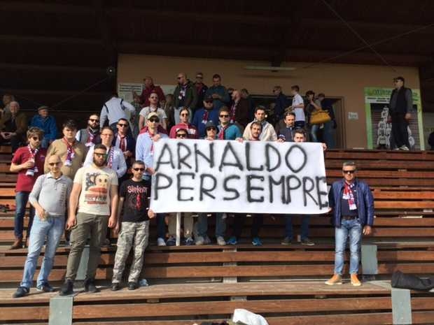 Nella foto il gruppo dei tifosi dell'Adriese omaggia lo storico grande presidente del club granata (ai tempi della Ciabatta Italia Adriese) Arnaldo Cavallari scomparso in settimana