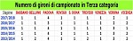 Sono 158 le società iscritte alla Terza categoria 2018/2019, cioè 13 in meno rispetto alle 171 di un anno fa. Di fatto è venuto a mancare un girone di campionato, passando dai 13 gruppi dell’ultima stagione ai 12 attuali. Nella redistribuzione geografica, a perderlo è stata la delegazione di Padova, che avrà 3 gironi anziché 4.