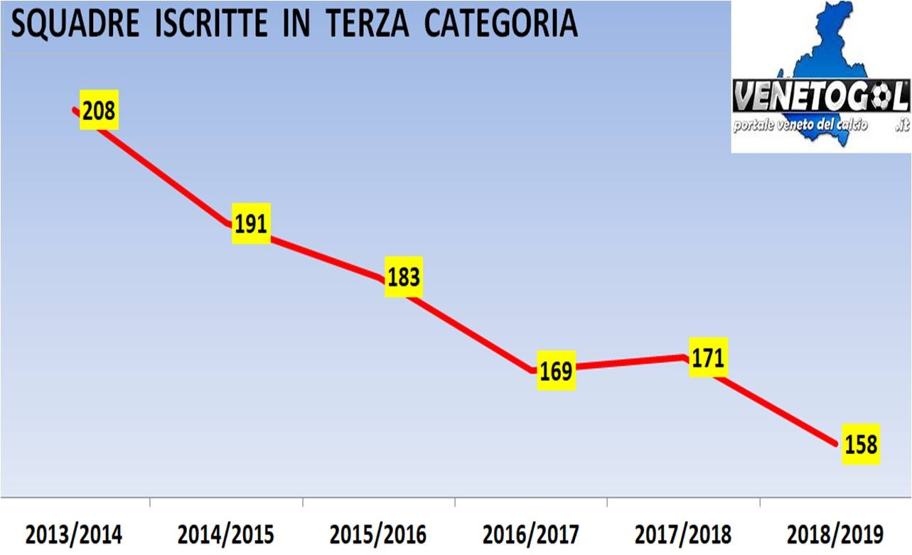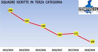Nella galleria immagini è consultabile il grafico delle iscrizioni in Terza categoria negli ultimi 6 anni. Si è sorvolato su alcuni aspetti secondari, come il numero variabile di compagini venete retrocesse dalla Serie D (che influenza a cascata gli organici delle serie regionali) o il fatto che quest’anno è stata ripescata una squadra in ogni categoria per portare a 17 anche il girone A di Eccellenza.