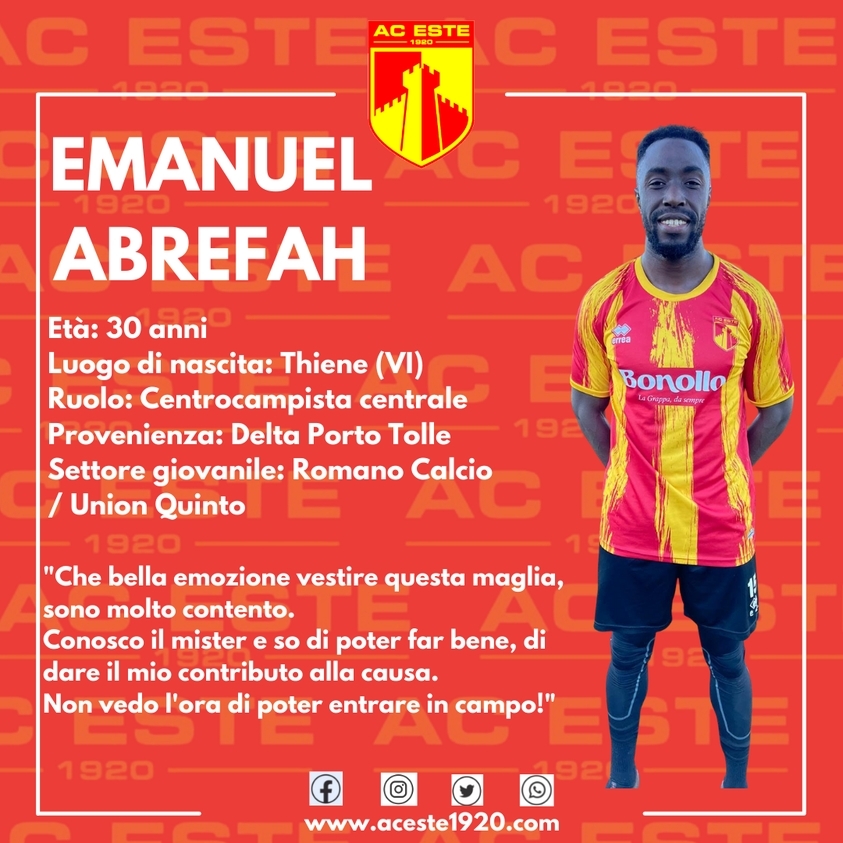 Vai alla galleriaQuarto acquisto della sessione invernale di mercato per l'Este in Serie D. Il direttore generale Davide Sannazzaro ha ingaggiato il centrocampista centrale Emanuel Abrefah (nella foto), classe 1991, in arrivo dal Delta Porto Tolle. E' un ex Montebelluna, Union Clodiense e Triestina fra le altre.