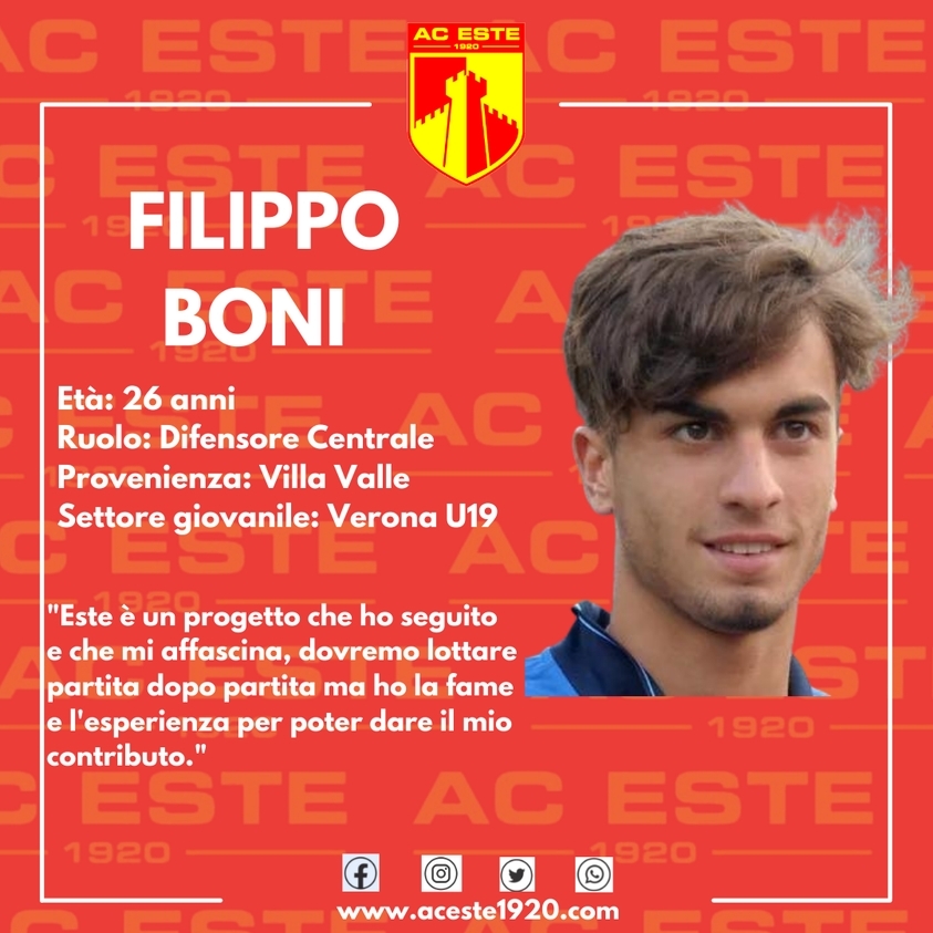 Partiamo dall'Este in Serie D. Il direttore generale Davide Sannazzaro ha puntellato la difesa con il centrale Filippo Boni (foto in galleria), classe 1995, in arrivo dal Villa Valle, squadra del girone B di Serie D. In carriera ha giocato anche con Cuneo, Pistoiese e Prato Clicca qui per la scheda
