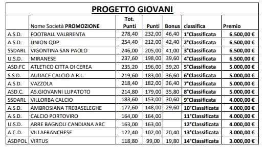 Promozione: la classifica del 'Progetto giovani' con i premi in denaro
