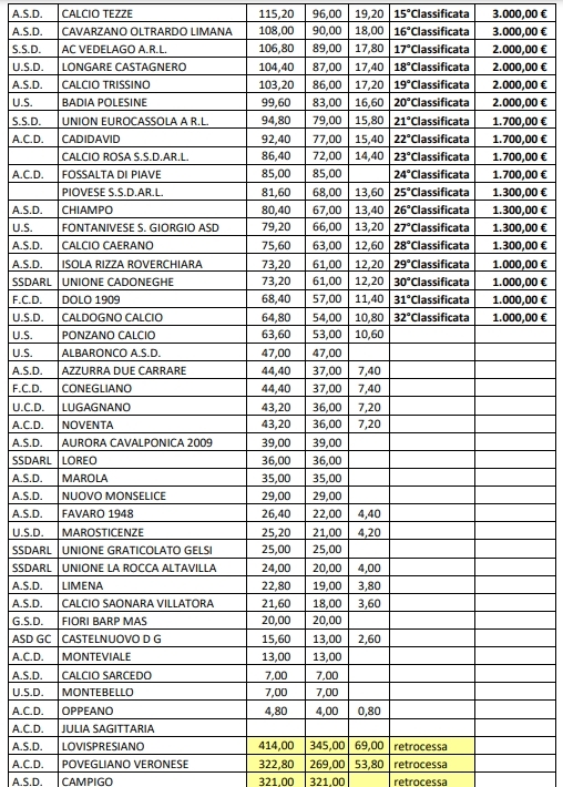 Nella classifica unificata dei 70 club di Promozione (vedi immagini nella galleria in basso) al primo posto assoluto c'è il Football Valbrenta con 278,40 punti, che valgono un premio di 6.500 euro.