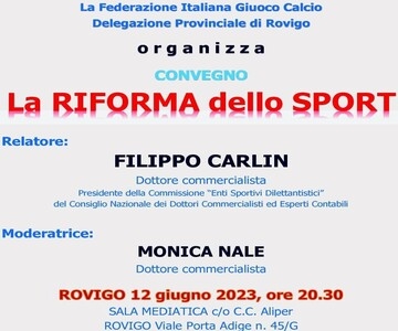 Vai alla galleriaStasera (lunedì) presso la Sala mediatica dell'Aliper di Rovigo si parlerà della nuova riforma dello sport con il dottore commercialista, nonché presidente della commissione "Enti sportivi dilettantistici" del Consiglio nazionale dei dottori commercialisti ed esperti contabili Filippo Carlin, e la moderatrice Monica Nale, commercialista.