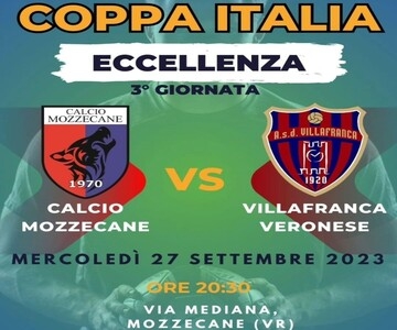 Stasera (mercoledì) alle ore 20.30 si recupera Mozzecane-Villafranca Veronese, match valevole per la terza giornata del quadrangolare A della Coppa Italia regionale di Eccellenza.