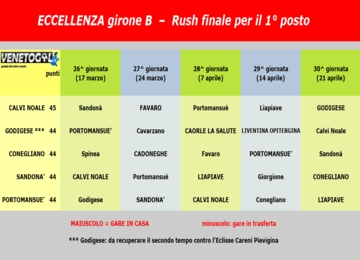 Abbiamo schematizzato il rush finale riportando gli avversari di ogni formazione (clicca sull'immagine in basso). Fuochi d'artificio già nel prossimo turno con due scontri diretti: Sandonà-Calvi Noale e Godigese-Portomansuè.