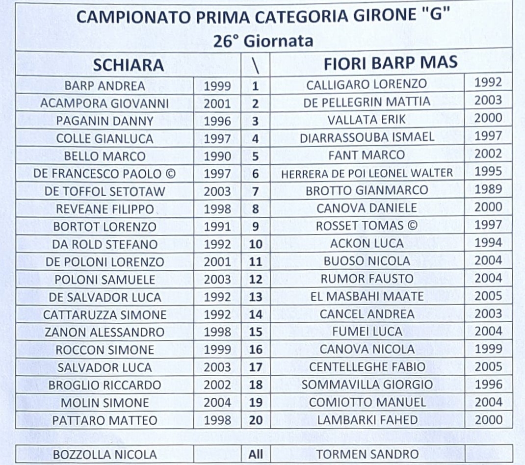 Fiori Barp Mas: Calligaro, De Pellegrin, Vallata, Diarrassouba, Fant, Herrera De Poi, Brotto, Canova, Rosset, Ackon, Buoso.
