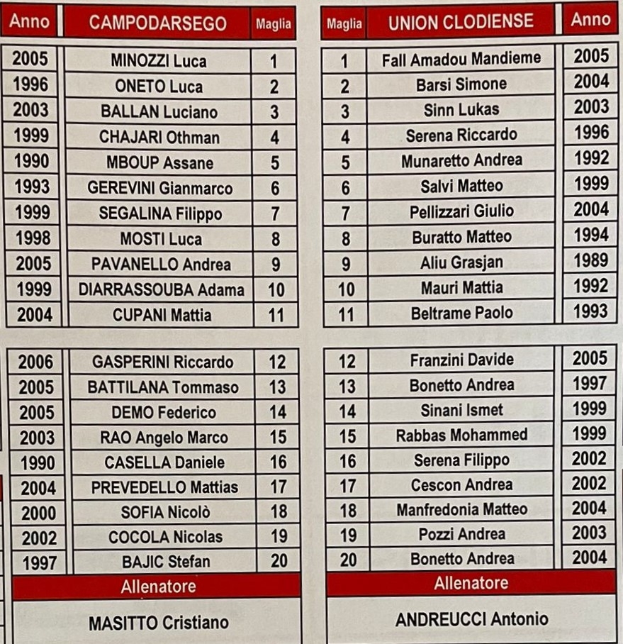 Campodarsego: Minozzi, Oneto, Ballan, Chajari, Mboup, Gerevini, Segalina, Mosti, Pavanello, Diarrassouba, Cupani.