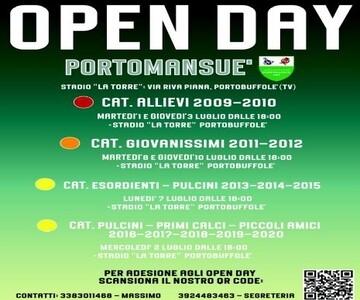 Vai alla galleriaLa società A.C.D. Portomansuè è lieta di annunciare che per preparare al meglio la nuova stagione sportiva 2025/2026 organizza gli “Open Day” presso lo stadio “La Torre” di via Riva Piana a Portobuffolè (TV).