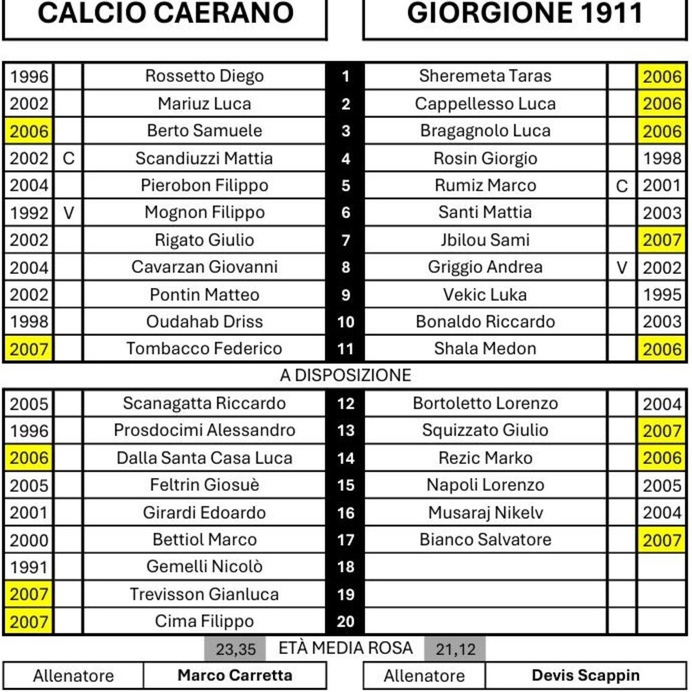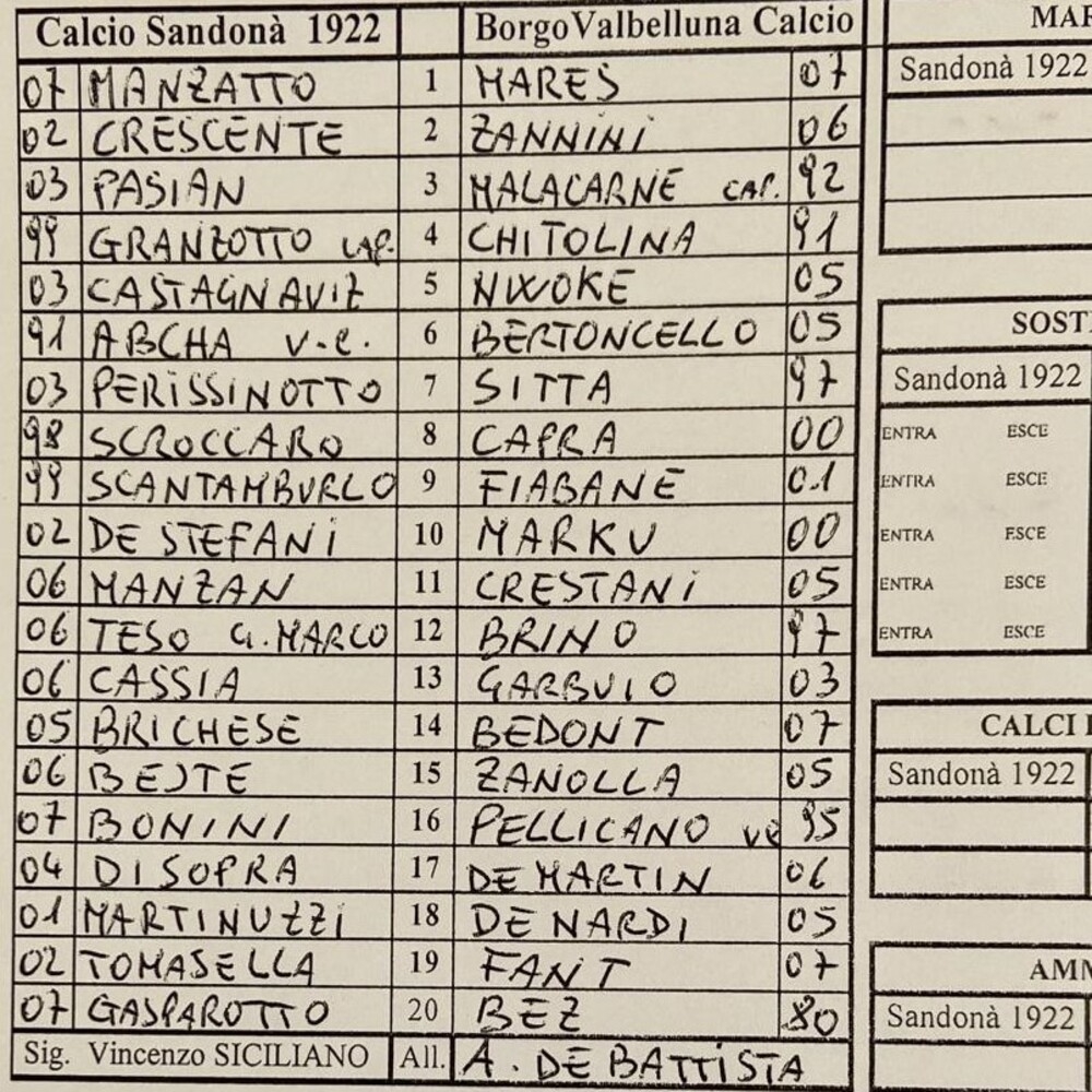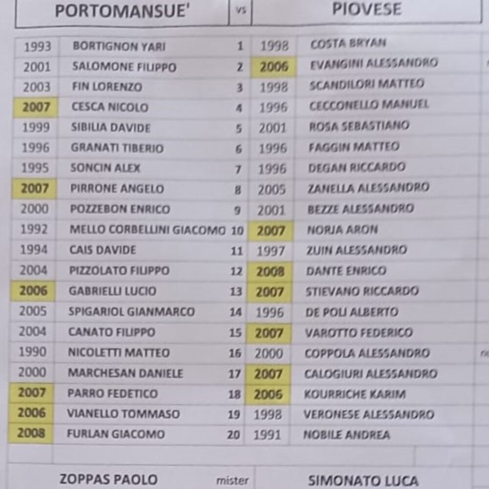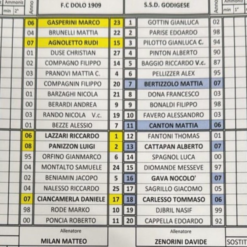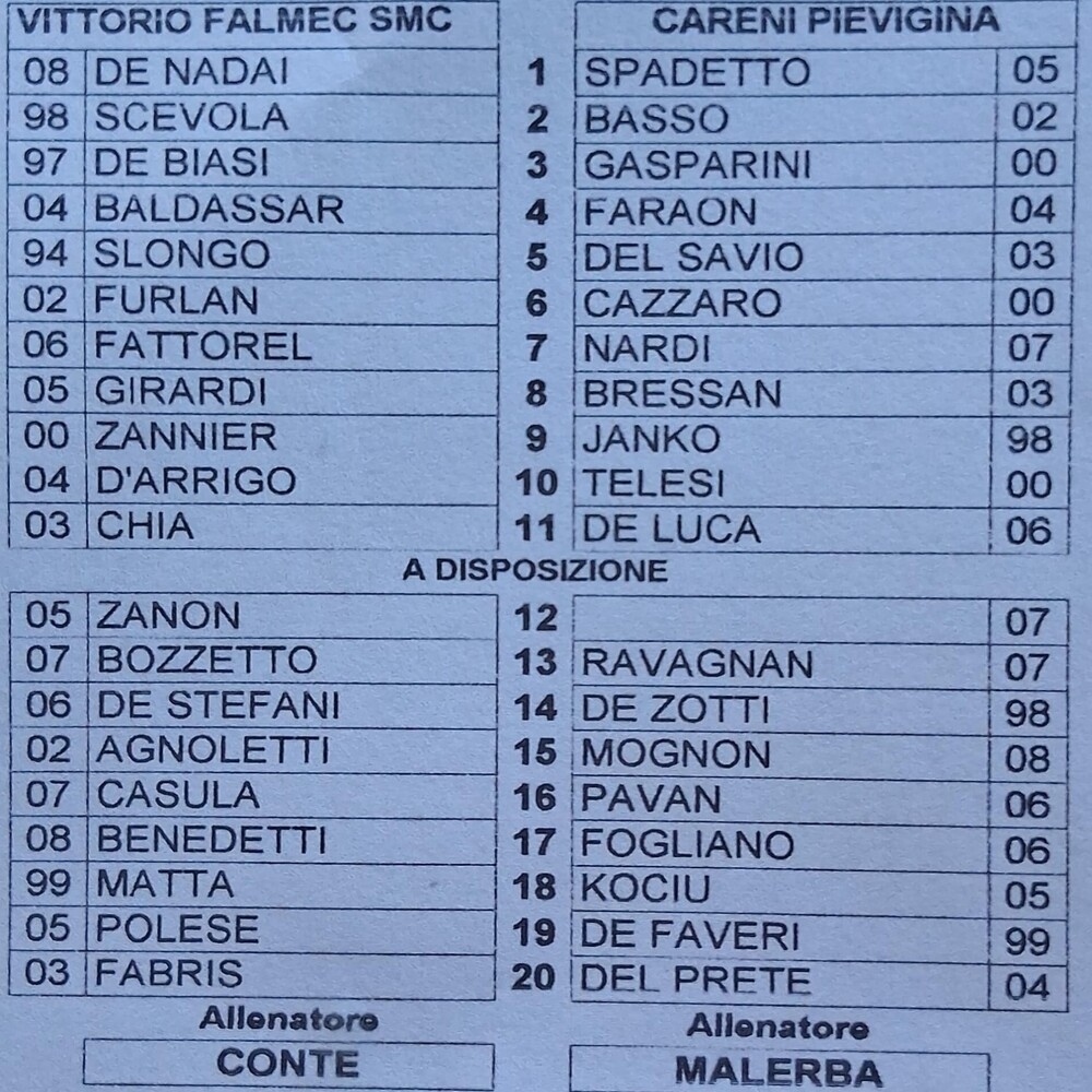N.B. Nella distinta dell'Eclisse Careni Pievigina il numero 12 è Alberto Falso (classe 2007).