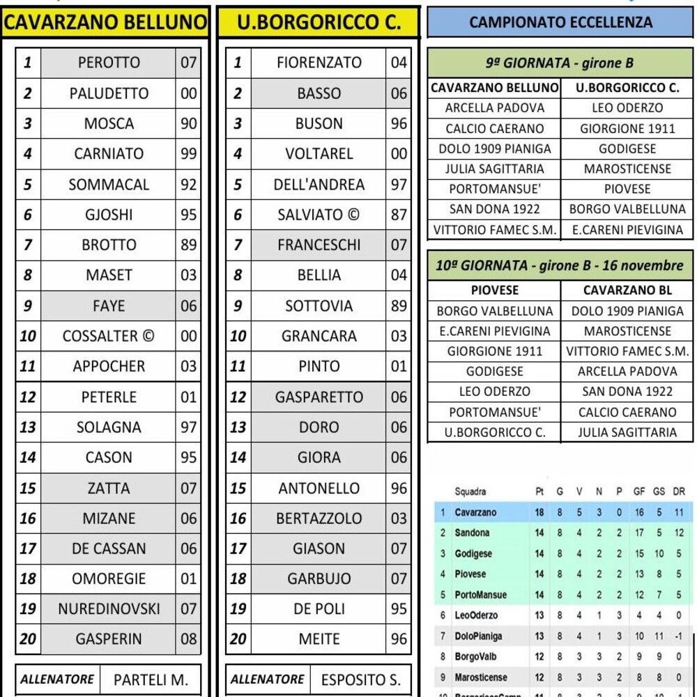 Eccellenza girone B. Formazioni e risultati della 9. giornata