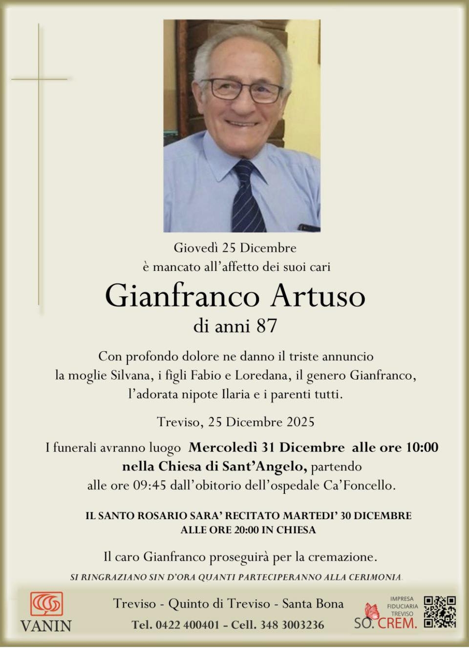 Vai alla galleriaSi svolgeranno mercoledì 31 dicembre alle ore 10, nella chiesa di Sant'Angelo a Treviso, i funerali di Gianfranco Artuso (nella foto), presidente della società Condor Treviso, mancato il 25 dicembre all'età di 87 anni.