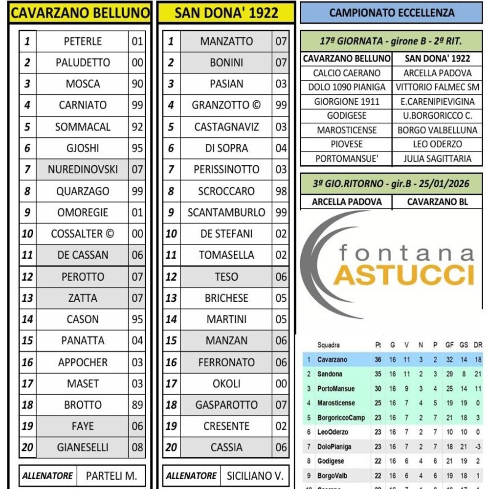 Un gran gol di Quarzago all'89' decide lo scontro al vertice Cavarzano-Sandonà, con i bellunesi ora a +4 sui rivali. La Marosticense rafforza la posizione playoff, parità tra PortoMansuè e Julia Sagittaria. Colpi esterni di Arcella, BorgoriccoCampetra e LeO Oderzo a Caerano, Godego e Piove di Sacco. Reti bianche a Castelfranco, Vittorio Falmec sempre più ultimo