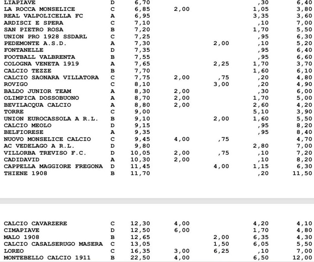 Alle spalle dei bellunesi altre due squadre del girone D: Carbonera Breda e Union Dese. Al 64° ed ultimo posto regionale il Montebello