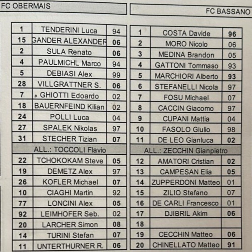 Reti: 36' pt Fasolo (B), 20' st Ghiotti (O), 35' st Unterthurner (O)